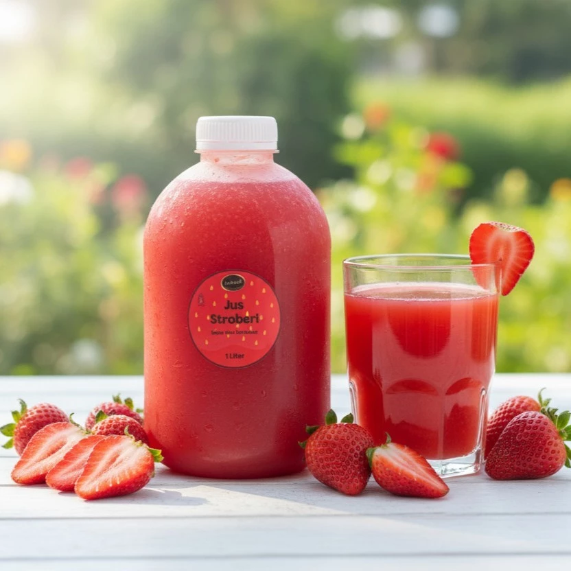 Segar manis-asam dari stroberi asli, kaya vitamin C. Kemasan 1 liter, nikmat diminum dingin!